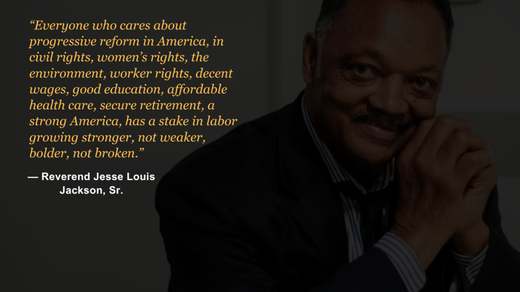 His historic presidential campaigns reshaped the American political landscape. They expanded the definition of leadership and inspired generations of Black leaders and working-class leaders of every background to step forward. By insisting that the concerns of everyday workers belonged at the center of national debate, he helped unions claim their rightful place in the broader struggle for justice.